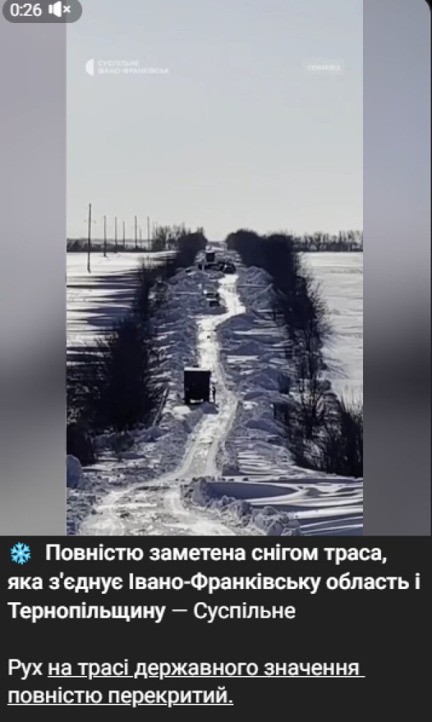 Крім того, траса, що сполучає Івано-Франківську та Тернопільську області, повністю вкрита снігом. Рух цією важливою трасою в даний час повністю перекрито.