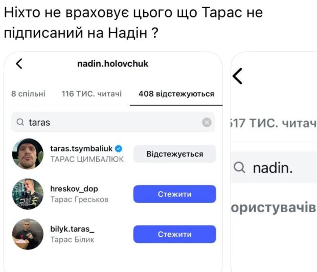 Уважні користувачі Instagram помітили, що Тарас не підписаний на обліковий запис Надін, що незвичайно в той час, коли більшість зірок та учасників реаліті-шоу підтримують публічні онлайн-зв'язки.
