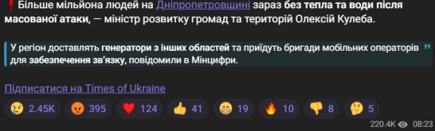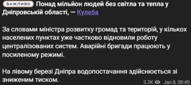За даними Куліби, понад мільйон людей на Дніпропетровщині залишилися без електрики та опалення. У низці населених пунктів уже частково відновлено централізовані комунальні послуги, а аварійні служби продовжують працювати цілодобово. На лівому березі Дніпра подача води здійснюється під зниженим тиском, продовжуються ремонтні роботи.