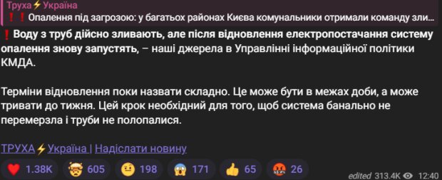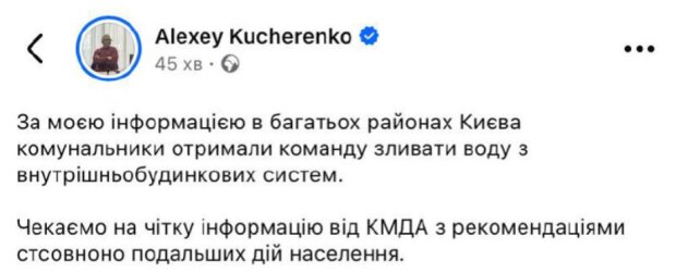 За повідомленнями, комунальні служби Києва отримали завдання почати відкачувати воду з труб будинків як запобіжний захід на тлі кризи, що продовжується, що торкнулася критичну інфраструктуру міста.