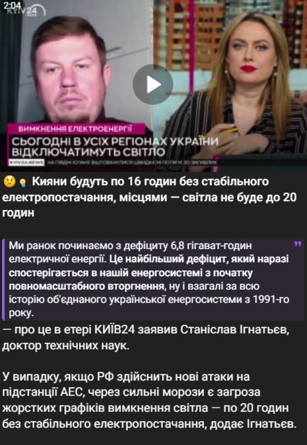 Станіслав Ігнатьєв, доктор технічних наук, зазначив, що подальші удари російських військ по підстанціям АЕС можуть призвести до ще більш жорстких графіків відключення світла, особливо в умовах сильних морозів, що продовжуються, залишаючи жителів без стабільного електропостачання на тривалі періоди.