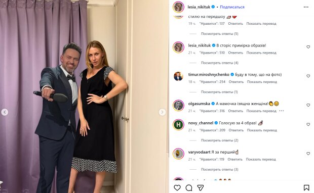 У дописі телеведуча з гумором написала, що тепер мамина шафа — це її особиста костюмерна. А ще додала фотомонтаж, де «приміряла» себе у різних образах поруч зі своїм телевізійним партнером Тимуром Мірошниченком, чим добряче повеселила підписників.