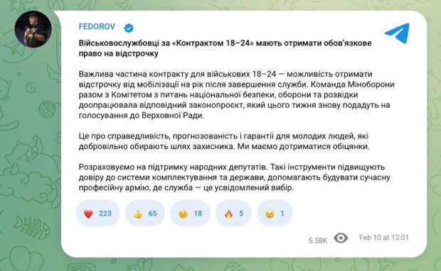 Міністерство оборони України запропонувало новий законопроект, який надає молодим військовослужбовцям-контрактникам віком від 18 до 24 років право на відстрочку від мобілізації на один рік після завершення контрактної служби, як заявив Михайло Федоров.