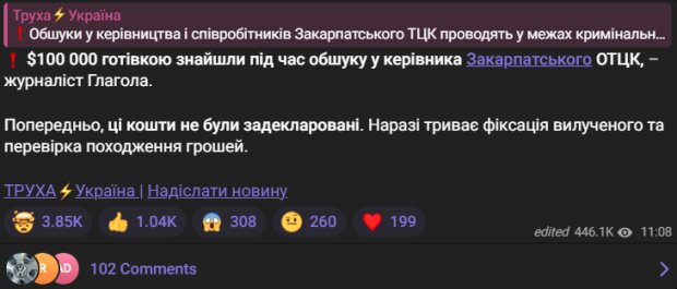 В ходе одного из обысков следователи обнаружили около 100 000 долларов США наличными, принадлежащих руководителю Закарпатского областного ТЦК.