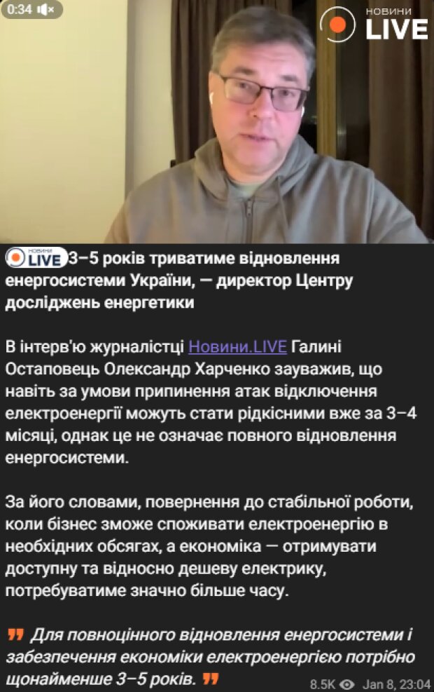 Он подчеркнул, что полное восстановление национальной энергосистемы — это многолетний процесс, который, вероятно, потребует не менее трех-пяти лет для полного восстановления ее функциональности.