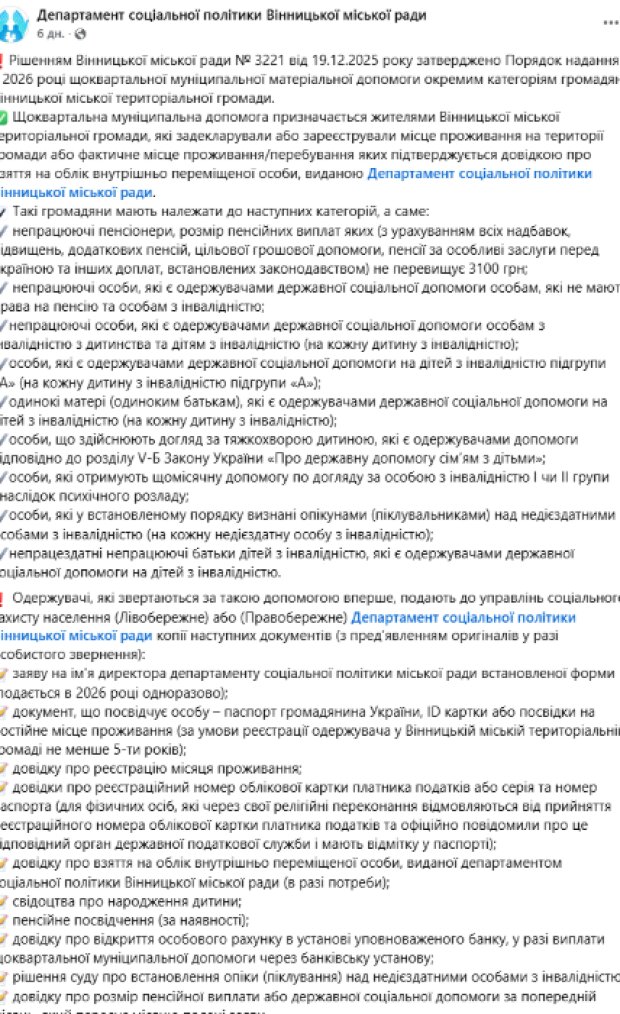 Заявление необходимо подать в одно из управлений социальной защиты (правобережное или левобережное подразделения Департамента социальной политики Винницкого городского совета). Заявление подается один раз в течение 2026 года.