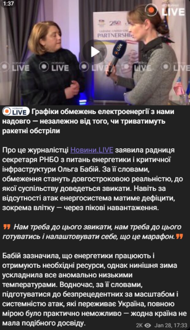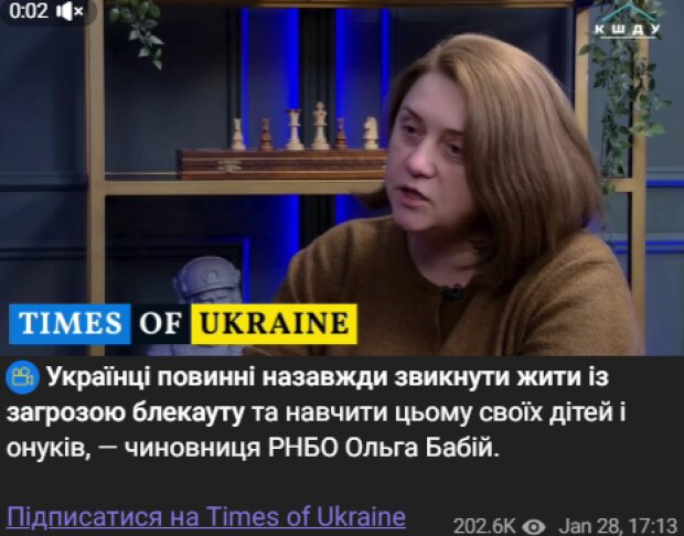 «Украинцы должны навсегда привыкнуть жить с угрозой блэкаута и научить этому своих детей и внуков, — чиновница СНБО Ольга Бабий», - говорится в сообщении.